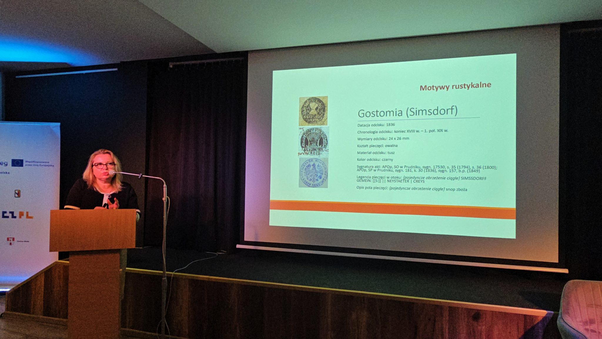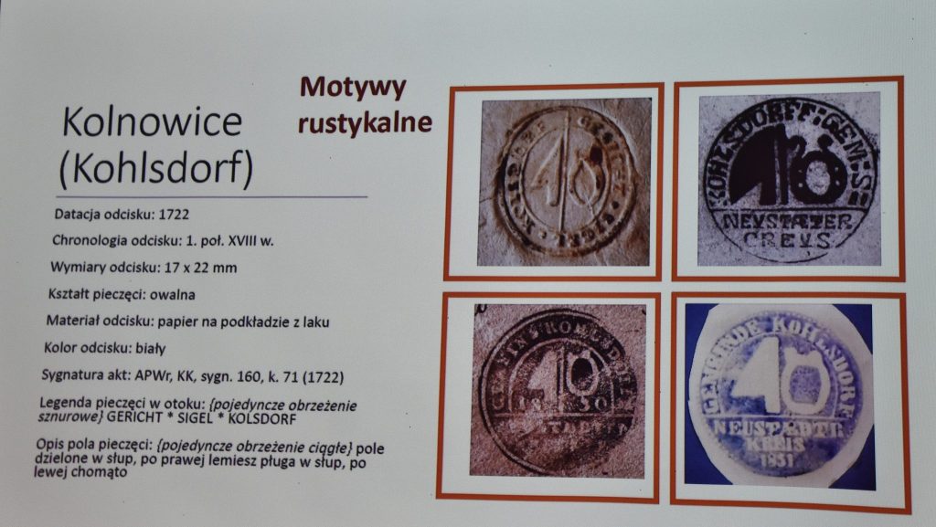 Po smacznej przerwie temat pieczęci dawnych gmin wiejskich w okolicach Białej przedstawiła dr Aleksandra Starczewska-Wojnar z Archiwum Państwowego w Opolu. Nasza redakcja, wydawnictwo, ma w tym temacie swój wkład, ponieważ w 2002 r., jako jedni z pierwszych na Śląsku, na łamach rocznika „Ziemia Prudnicka”, opublikowaliśmy katalog pieczęci gmin wiejskich z powiatu prudnickiego w jego historycznych granicach. Później wykorzystywane były przy okazji lokalnych wydarzeń, w publikacjach i na tablicach turystycznych i przydrożnych. Aleksandra Starczewska-Wojnar zgłębiła temat i zakresem terytorialnym objęła region opolski. Sięgnęła również po pieczęcie z najstarszego, XVIII-wiecznego okresu. Odkrycie na nowo symboliki dawnych wsi istotnie wsparło tendencje do identyfikacji lokalnych społeczności pod wspólnym znakiem.