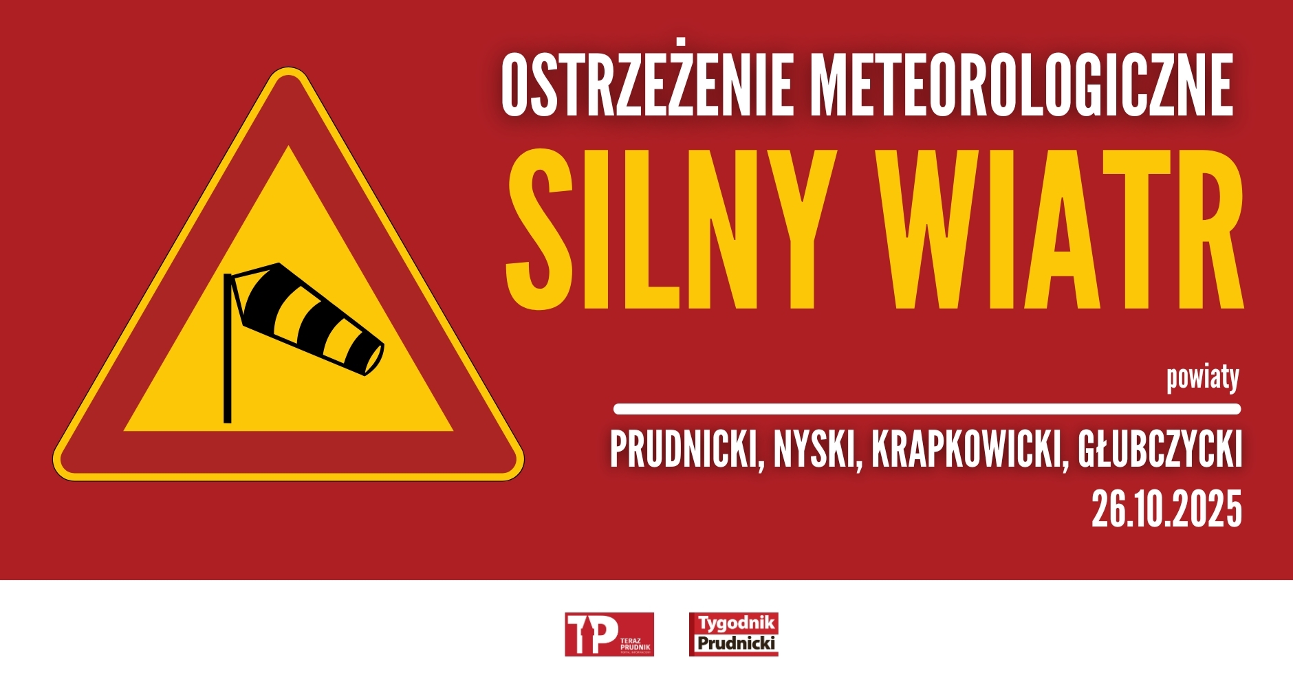 – Prognozuje się wystąpienie silnego wiatru o średniej prędkości do 45 km/h, w porywach do 75 km/h, z południowego zachodu – informuje Instytut Meteorologii i Gospodarki Wodnej. Ostrzeżenie dotyczy między innymi trzech śląskich województw: śląskiego, dolnośląskiego i opolskiego. Dla powiatów: prudnickiego, nyskiego, krapkowickiego i głubczyckiego alert obowiązuje w niedzielę, 26 października, od godz. 14.00 do północy.